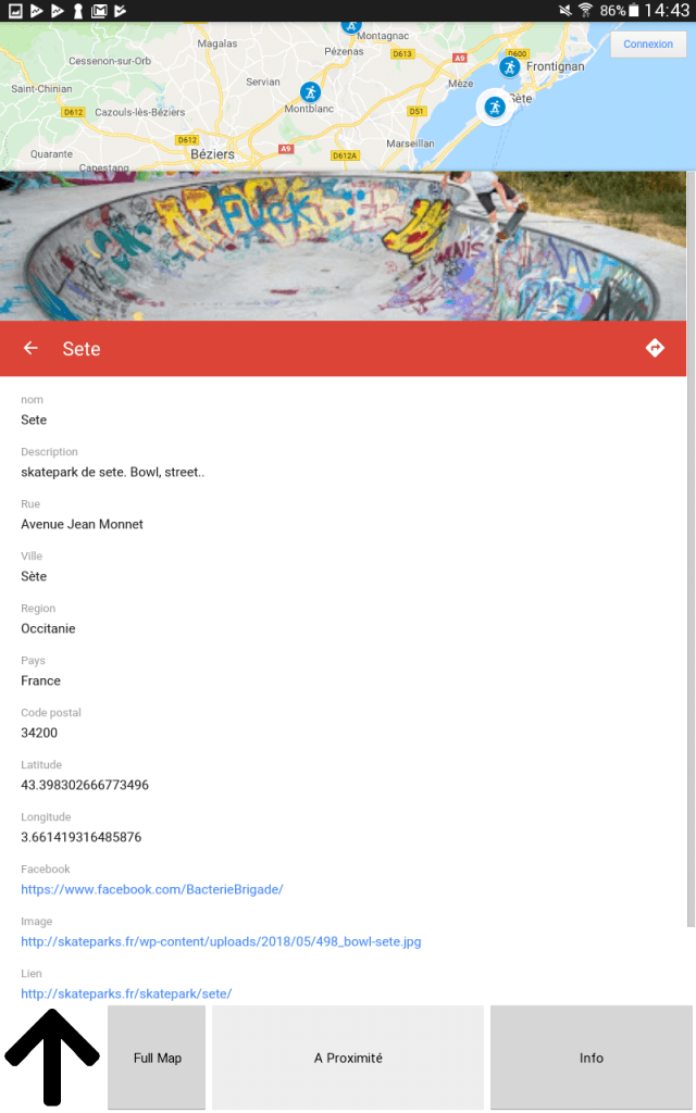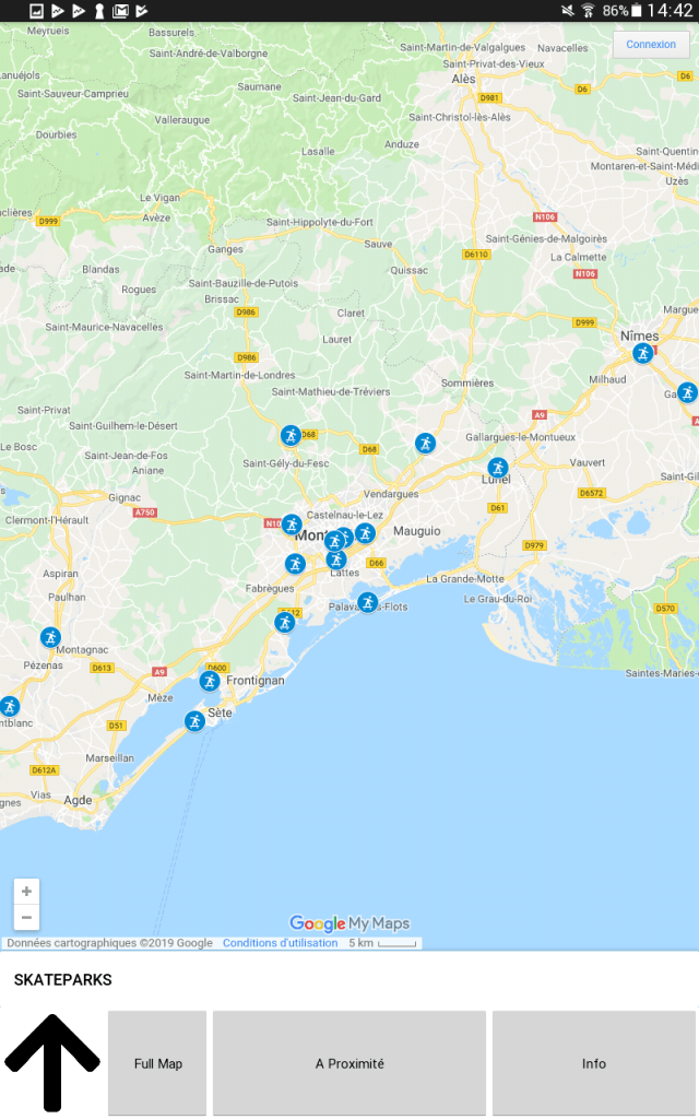 Elle permet de trouver les skateparks près de chez vous et d’accéder a l’itinéraire pour y aller.